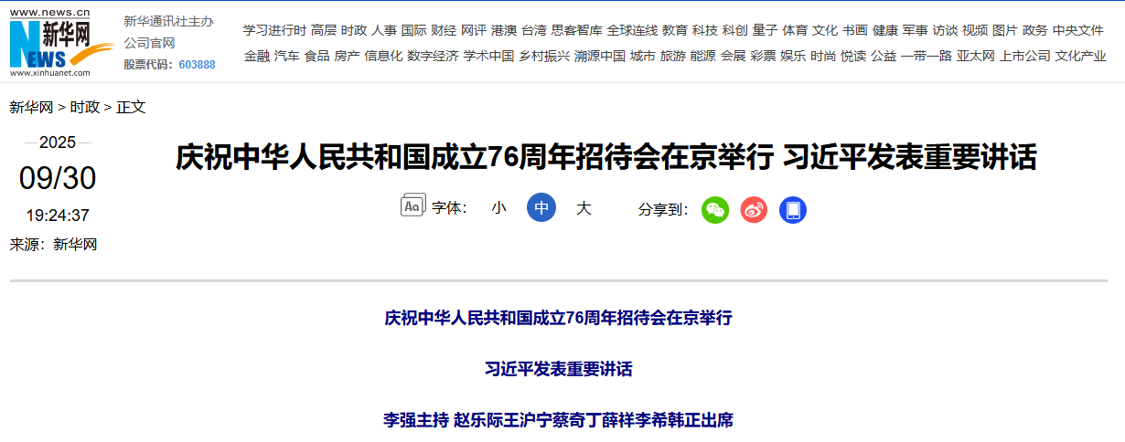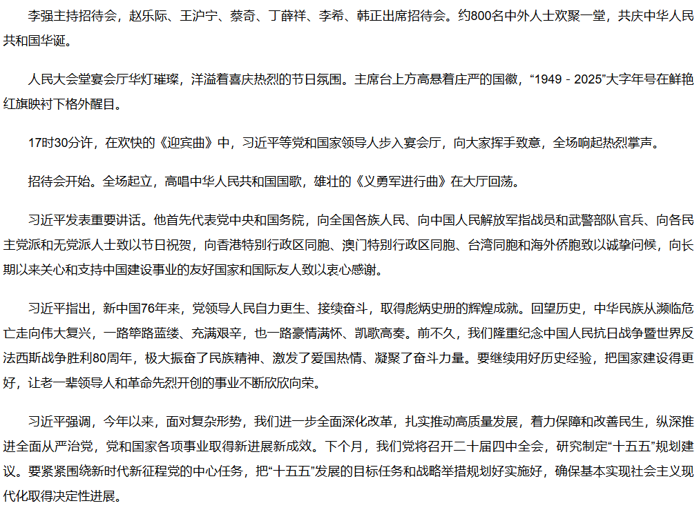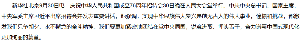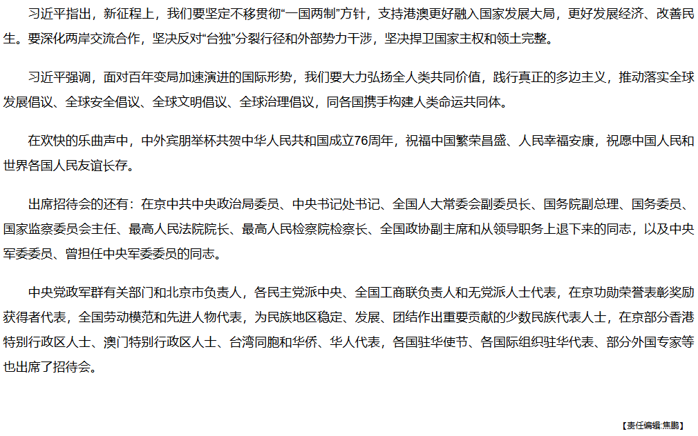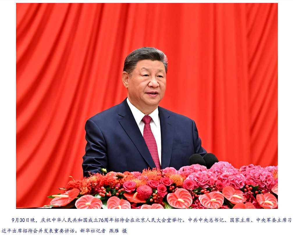 【学习进行时】庆祝中华人民共和国成立76周年招待会在京举行 习近平发表重要讲话