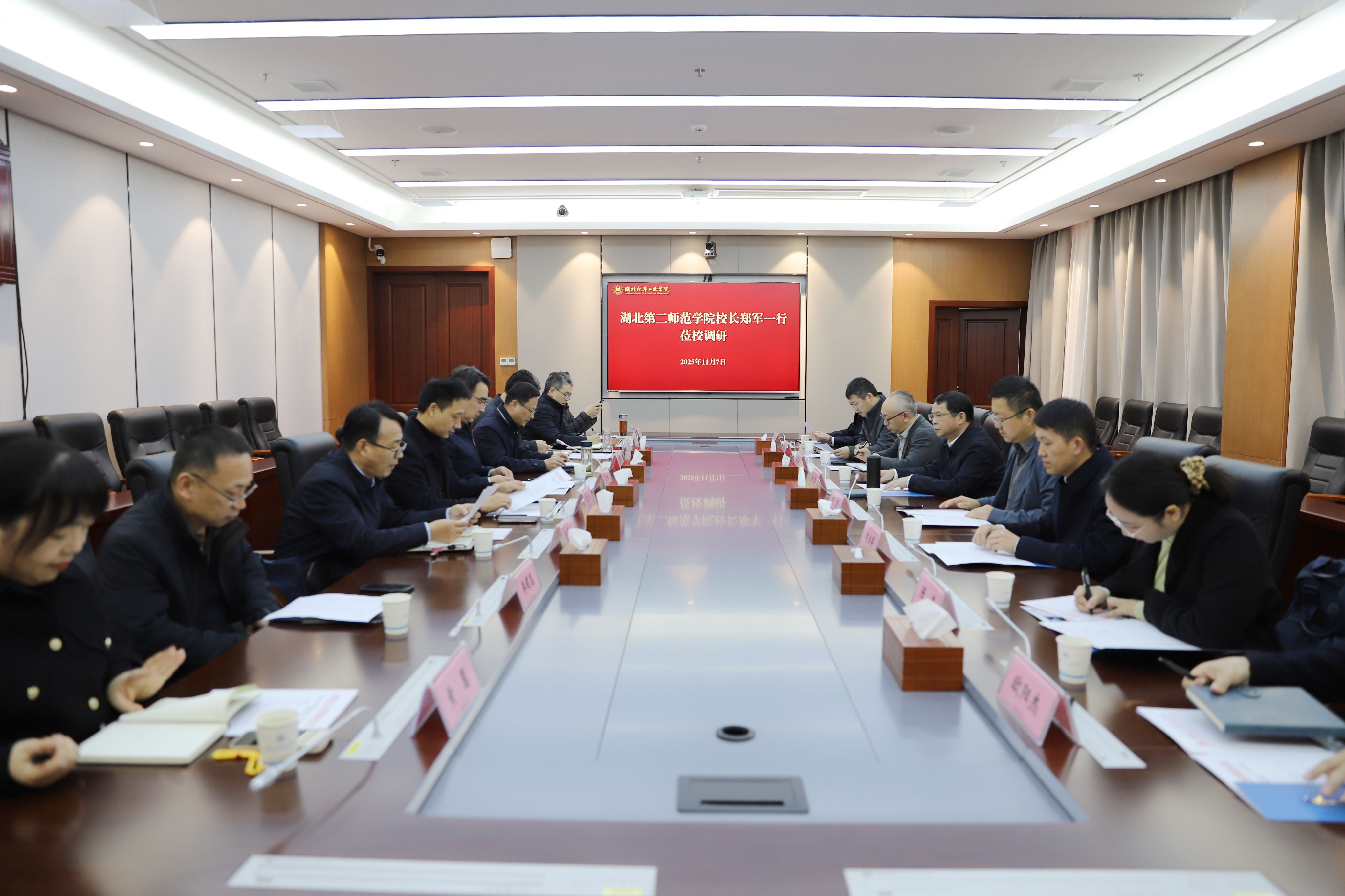 本网讯(文/图 邓玉洁)11月7日下午,湖北第二师范学院校长郑军一行来校调研交流。党委书记王晓,党委副书记、纪委书记、监察专员陈建平,党委常委、党政办公室主任王文山热情接待。