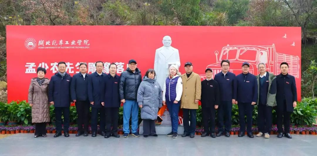 本网讯(文/图 邓玉洁)在湖北汽车工业学院首任院长孟少农先生诞辰110周年之际,12月12日上午,孟老家属代表孟运及其爱人张超、孟颀及其爱人方芬,东风汽车集团有限公司区域管理中心主任丁巍,东风电子科技股份有限公司总经理韩力,东风越野车传动设计总工程师汪振晓,以及全体校领导、离退休教师代表、相关职能部门负责人、师生代表齐聚学校汽车文化长廊“少农园”,共同参加孟少农先生雕像落成揭幕仪式。