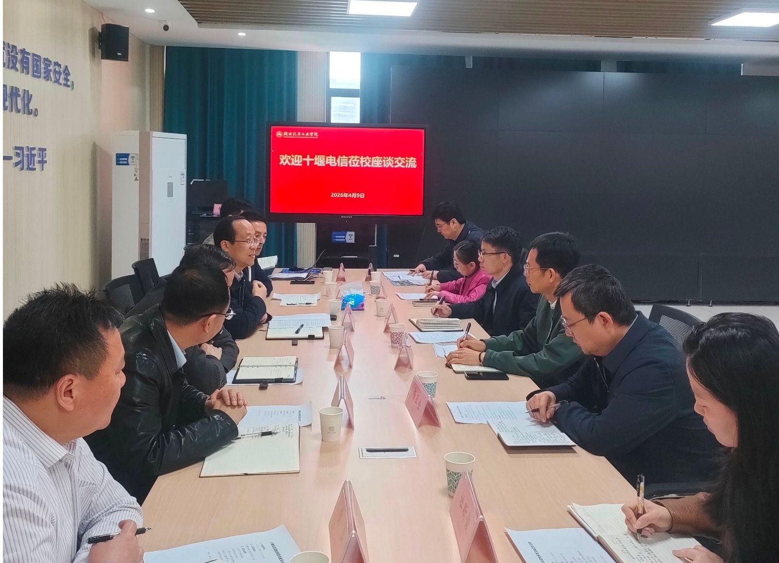 本网讯(文/图 黄召辉)4月9日上午,中国电信十堰分公司党委书记、总经理张海鹏一行莅临我校座谈交流。会前,校党委书记王晓、校长李涛亲切会见了张海鹏一行,双方就推进智慧校园建设、加强算力与人才培养协同、深化校企合作等事宜进行了深入交流。校党委常委、副校长王生怀出席座谈会。