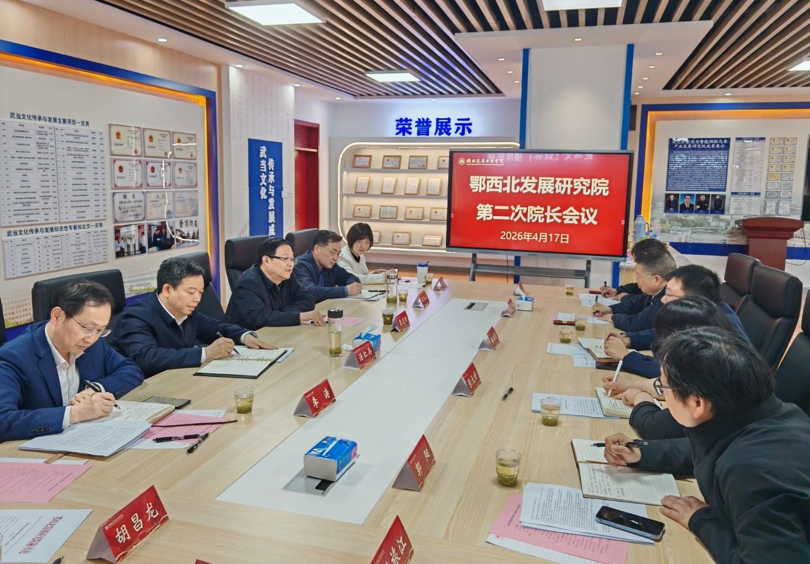 本网讯(文/图 肖俊涛)4月17日上午,在学校产教大楼四楼SX-403室鄂西北发展研究院成功召开第二次院长会议。会议由我校党委副书记、校长李涛主持。十堰市委常委、宣传部长汤红兵、鄂西北研究院院长办公会议成员、鄂西北研究院秘书处成员、鄂西北研究院专家委员会代表以及我校汽车商学院院长殷旅江、外语外贸学院院长杨荣广、设计学院副院长朱炜、马克思主义学院副院长安军、数字经济学院副院长李保林、汽车商学院系主任肖俊涛,以及学校教师代表40余人参加了会议。
