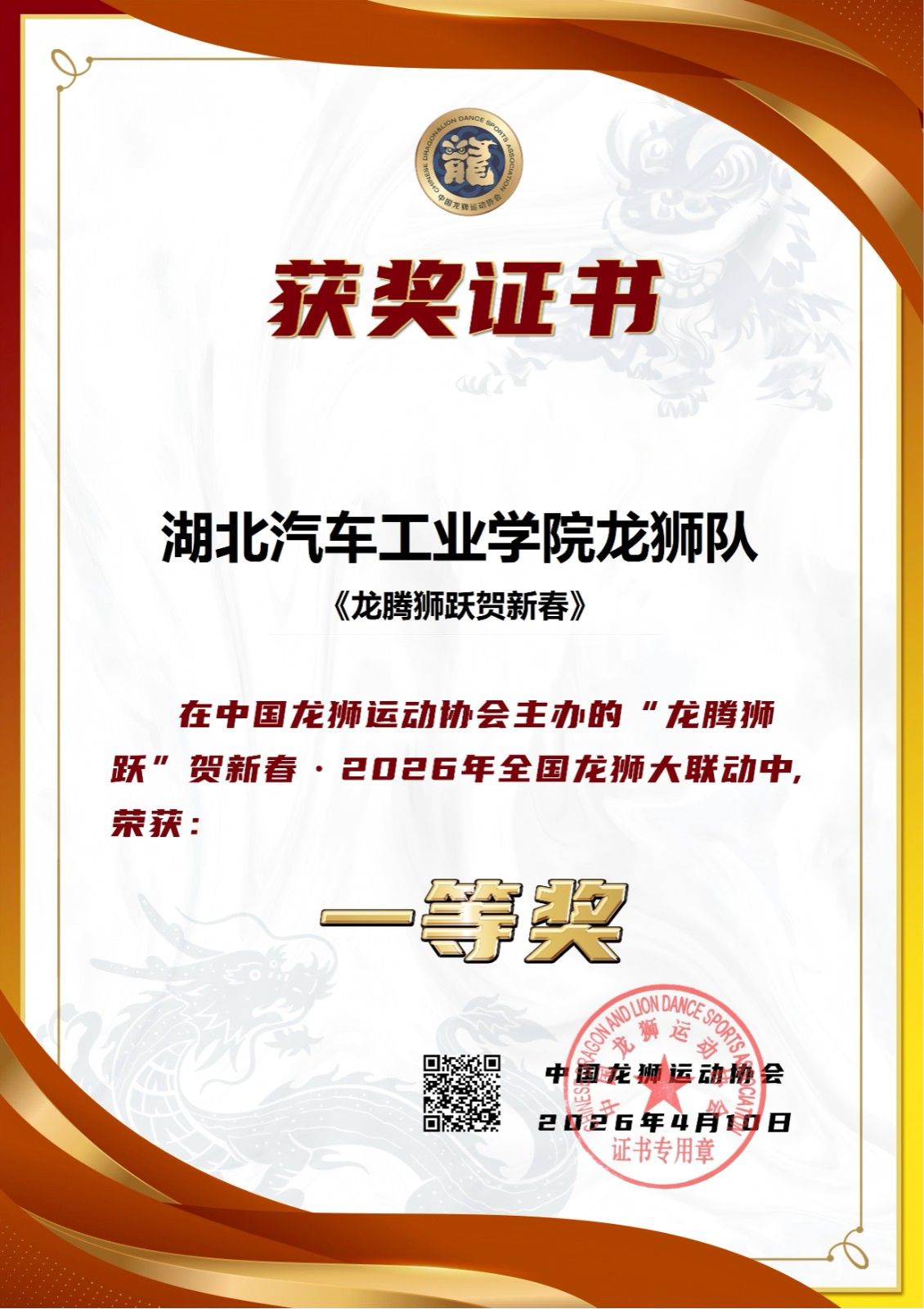 本网讯(文/余腾)4月17日,“龙腾狮跃”贺新春・2026年全国龙狮大联动比赛圆满收官。本次活动由中国龙狮运动协会主办,以“龙腾迎盛世,狮舞贺新春”为主题,采取线上提交与展示为主、线下评审相结合的形式开展。来自全国的百余支队伍报名参与角逐,竞争激烈。经主办单位初审,入围作品通过中国龙狮运动协会微信视频号集中展示,最终综合线上点赞量(占比50%)与专家评审打分(占比50%)对最具人气的前100名作品进行终评。我校代表队发挥出色,最终以总成绩第八名的优异表现荣获一等奖。