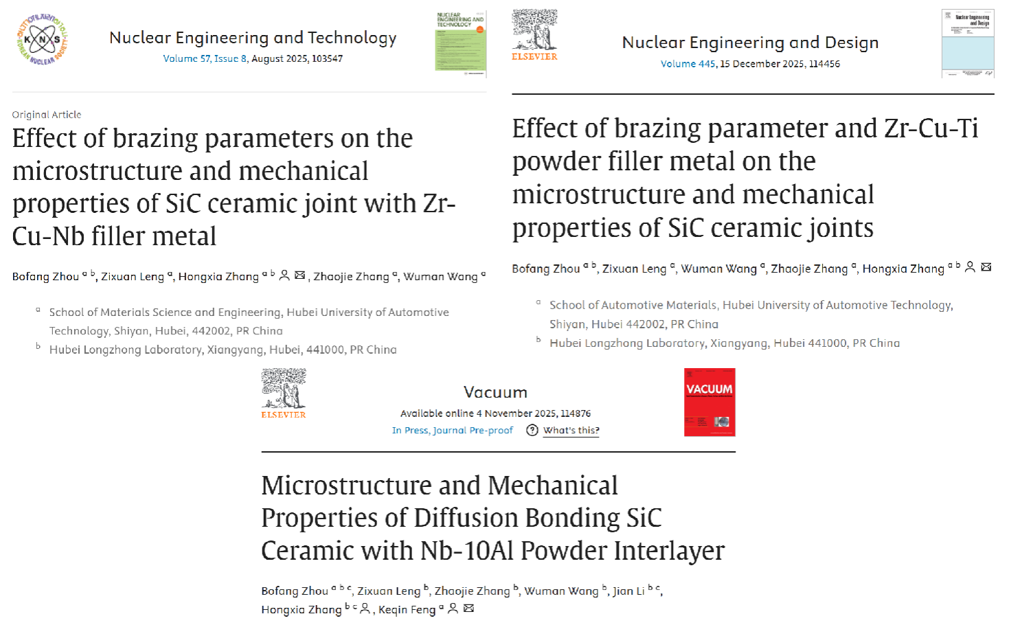 本网讯(文/才瑶)近日,在我校“材料复合与微纳改性技术”团队成员周博芳副教授等老师的指导下,研究生冷子旋、张兆杰以及王吴曼在超高温包壳材料研究领域取得重要突破。其研究论文Effect of brazing parameters on the microstructure and mechanical properties of SiC ceramic joint with Zr-Cu-Nb filler metal、Effect of brazing parameter and Zr-Cu-Ti powder filler metal on the microstructure and mechanical properties of SiC ceramic joints、Microstructure and Mechanical Properties of Diffusion Bonding SiC Ceramic with Nb-10Al Powder Interlayer分别在知名期刊Nuclear Engineering and Technology、Nuclear Engineering and Design、Vacuum上发表。
