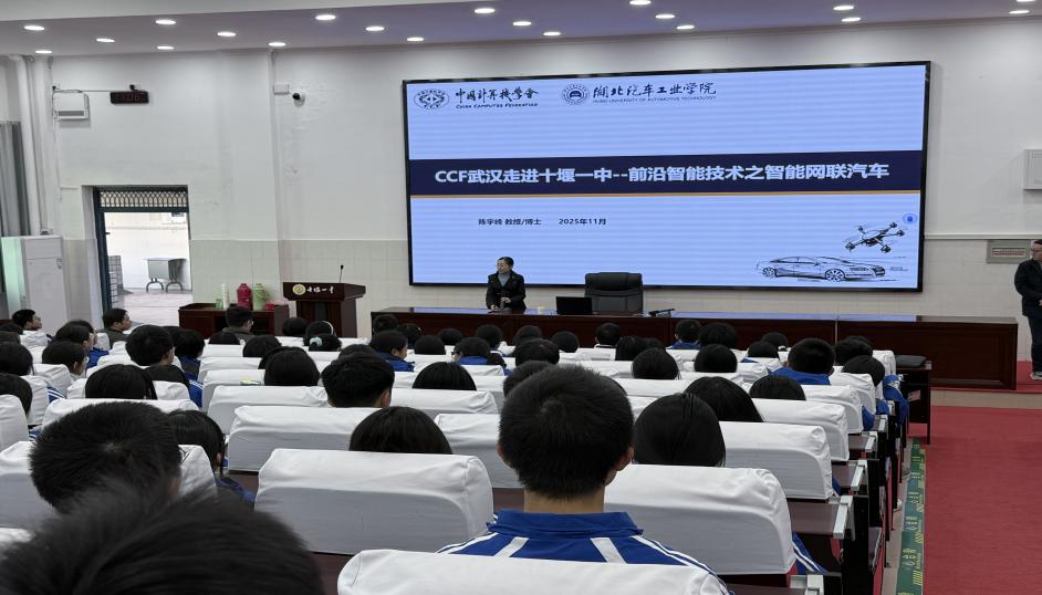 随后开展的CCF专场活动中,陈宇峰作为CCF武汉执委,先介绍了CCF的发展历程与宗旨。随后以《前沿智能技术之智能网联汽车》为题,深入浅出讲解产业背景、国内外发展现状,重点解析智能感知、网联控制等关键技术及未来趋势。互动环节,同学们围绕技术原理、应用场景等展开热烈交流,现场氛围活跃。(审稿 曾小岩)