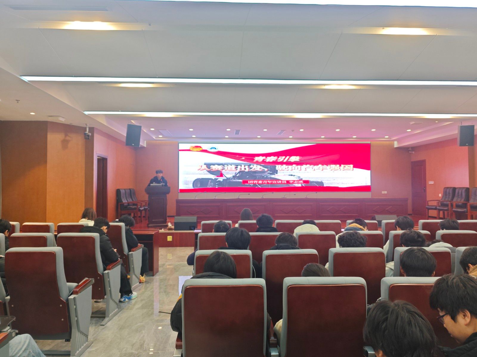 胡霄寒以“设计‘新’起来,以青春创意践行文化强国使命——深学细悟党的二十届四中全会精神”为题,系统阐释了新时代设计学科在传承中华优秀传统文化、推动文化创新发展中的使命担当。李志成以“从赛道出发,驶向汽车强国”为主题,结合自身在东风HUAT车队的参赛经历,分享了团队在汽车设计、研发、竞技过程中的奋斗故事,生动诠释了青年学生“敢闯敢试、精益求精”的工匠精神。