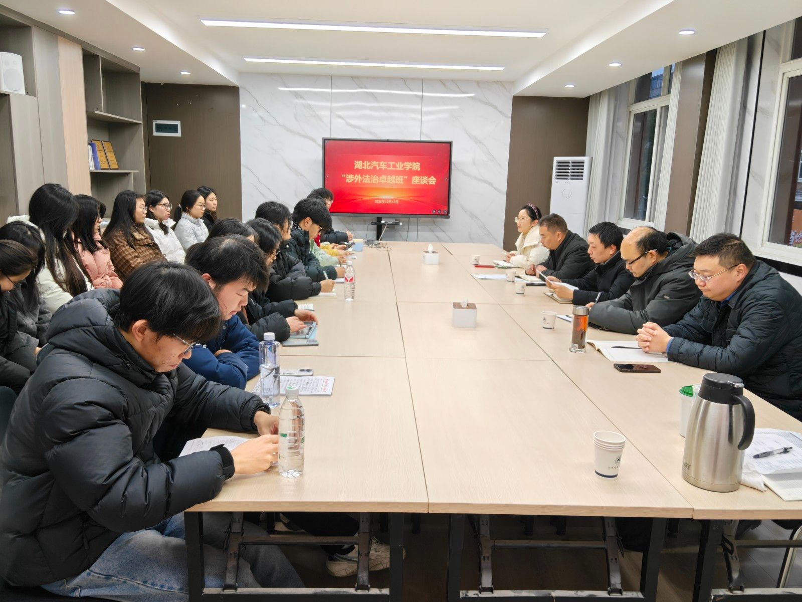 本网讯(文/图 黄钰雯)为精准掌握涉外法治卓越班学生学习动态,及时解决学习困惑,优化人才培养质量,12月12日,湖北汽车工业学院“涉外法治卓越班”座谈会在3206会议室顺利召开。教务处副处长孟光、外语外贸学院副院长王辰晖、法学院副院长成继平与安军、法学院专业负责人黄钰雯、法学系教师郑实及涉外法治卓越班全体同学参会,会议由成继平主持。