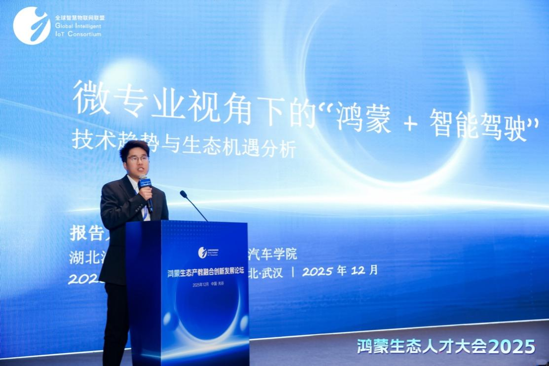 他指出随着鸿蒙系统向智能汽车领域延伸,产业对既懂汽车又懂操作系统的复合型人才提出了更高要求。对此,湖北汽车工业学院依托汽车特色学科优势,通过建设“鸿蒙+智能驾驶”微专业,探索培养跨领域应用型人才的新路径。