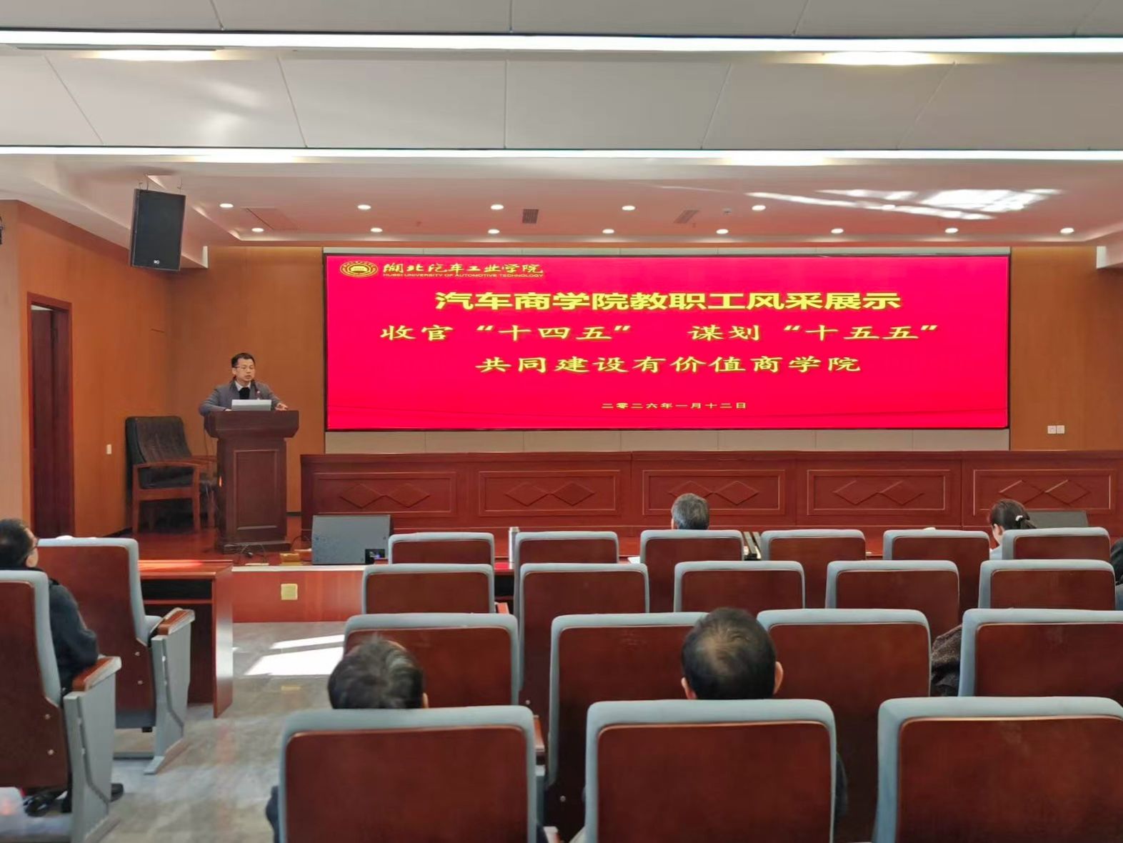 本网讯(文/罗珍)为全面盘点年度履职成效,凝聚发展共识与合力,科学擘画2026年工作蓝图,1月12日下午,汽车商学院在产教大楼三楼报告厅举行“收官‘十四五’ 谋划‘十五五’”教职工风采展示活动,学院领导班子、全体教职工到场参加,活动由院长殷旅江主持。