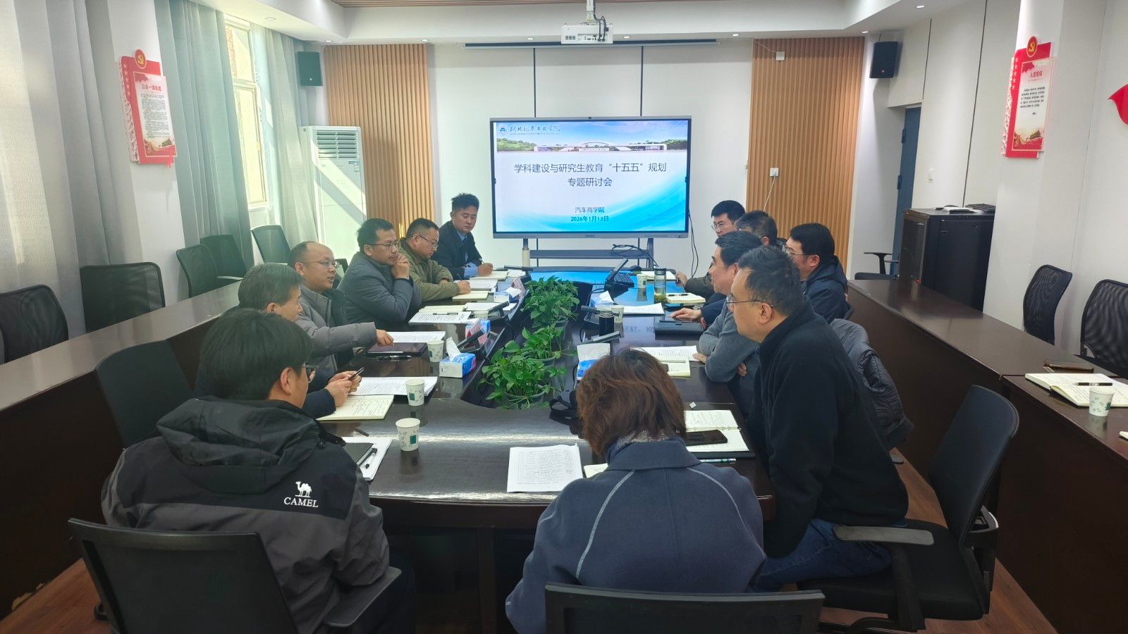 会议伊始,汽车商学院研究生教育教学办公室主任卢东阳汇报了学院学科建设与研究生教育现状,总结了“十四五”期间在学科建设、研究生教育、硕士点申报与评估、学科团队发展、科研平台建设等方面取得的成效,并围绕“十五五”期间学科特色强化、研究生培养质量提升、国际化推进等方面提出了初步规划思路。随后,胡姜指出,“十四五”期间,我院学科建设与研究生教育虽取得了显著进展,但在深入推进高质量发展过程中,仍存在诸多短板和挑战,如学科交叉融合的深度不够、学生科研创新与实践能力培养有待加强、质量保障与评价体系需进一步完善等。会中,与会人员围绕汇报内容展开深入研讨,就学科交叉融合、研究生招生及创新能力培养、课程体系优化、导师队伍建设等方面提出了一系列建设性意见与建议。