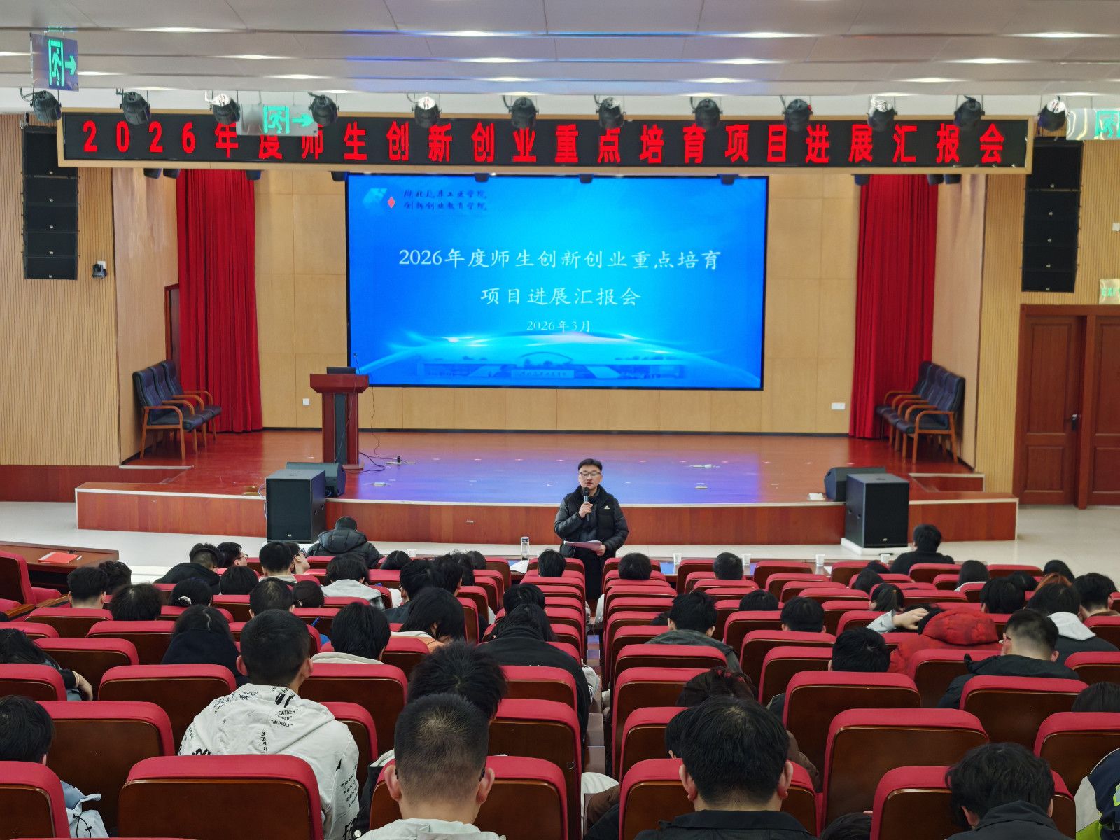 本网讯(文/程俊)3月9日下午,2026年度师生创新创业重点培育项目进展汇报会在学校产教融合楼四楼报告厅举行。各二级学院分管创新创业工作负责人、创新创业教育学院全体教职工,以及26支重点项目团队成员及指导教师参加本次汇报会。