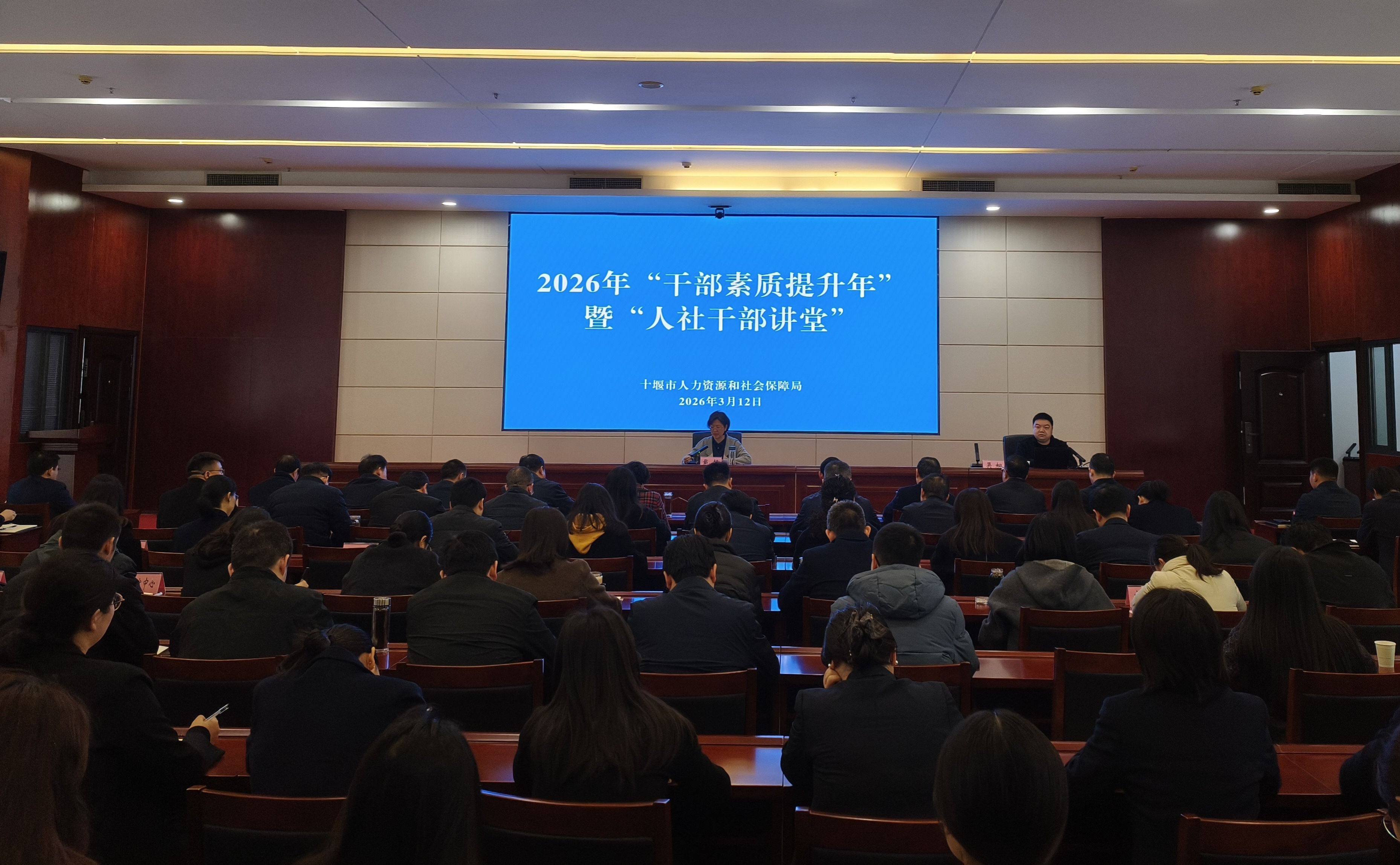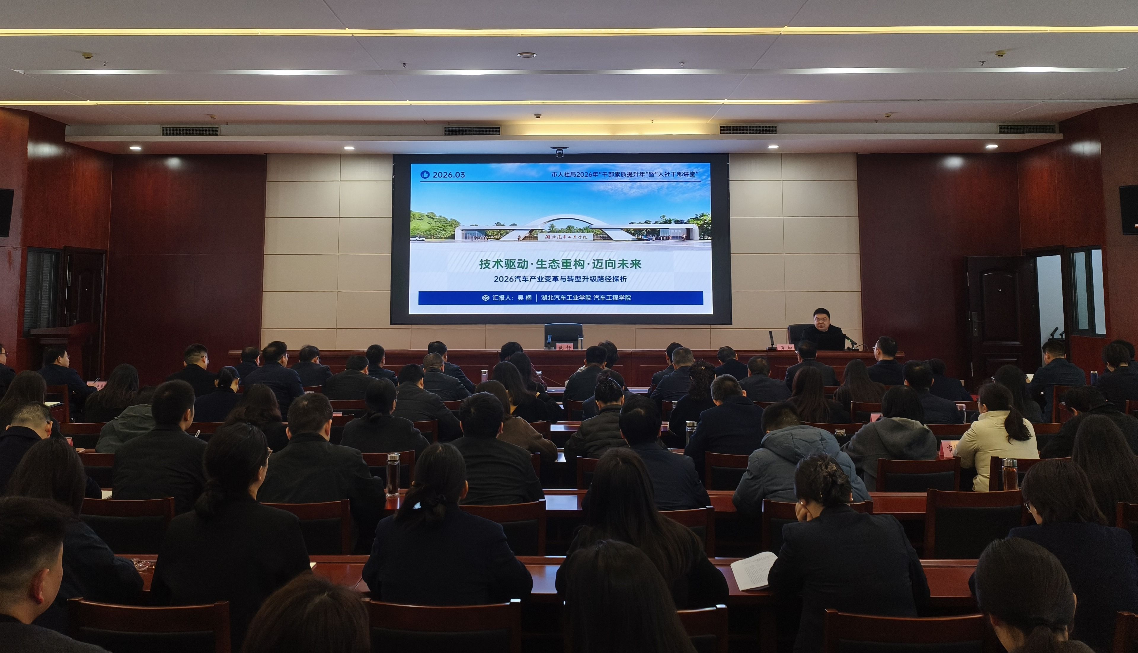 本网讯(文/图 丁嘉)为深入贯彻落实十堰市“干部素质提升年”工作部署,助力汽车产业转型升级,3月12日,十堰市人社局2026年“干部素质提升年”暨“人社干部大讲堂”第一期活动在市人社局会议室成功举办。本次活动以“2026年汽车产业变革与转型升级路径探析”为主题,我校汽车工程学院吴桐博士担任主讲嘉宾,市人社局局长戴静出席开班式并作动员讲话,全局干部职工200余人参加培训学习。