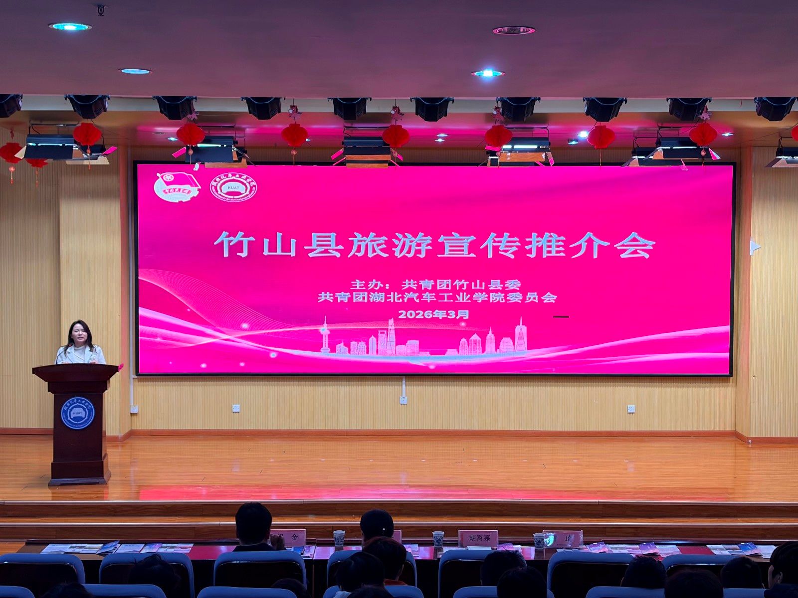 本网讯(文 曹庭钊、高歌/图 孙章杰)3月18日下午,竹山县旅游宣传推介会在我校图书馆报告厅成功举办。校团委副书记胡霄寒、团竹山县委书记胡金、竹山县旅游产业服务中心副主任邓荣平及180余名学生参加本次活动。