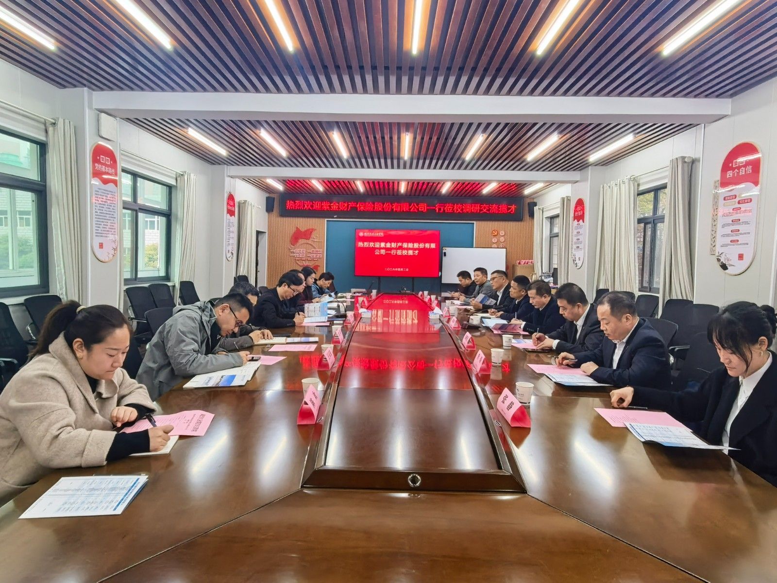 座谈会上,李建忠详细介绍了我校办学特色、学科布局、专业优势以及人才培养的成果。紫金财险人事行政部经理朱刚勇对我校的办学底蕴和毕业生综合素质给予了高度评价,并系统介绍了企业发展现状、业务布局、实习实训体系及人才需求,期待更多汽院优秀学子加入企业。随后,双方围绕定制化人才培养、订单班、实习实践基地建设等议题深入交流,进一步凝聚合作共识,明确对接方向。
