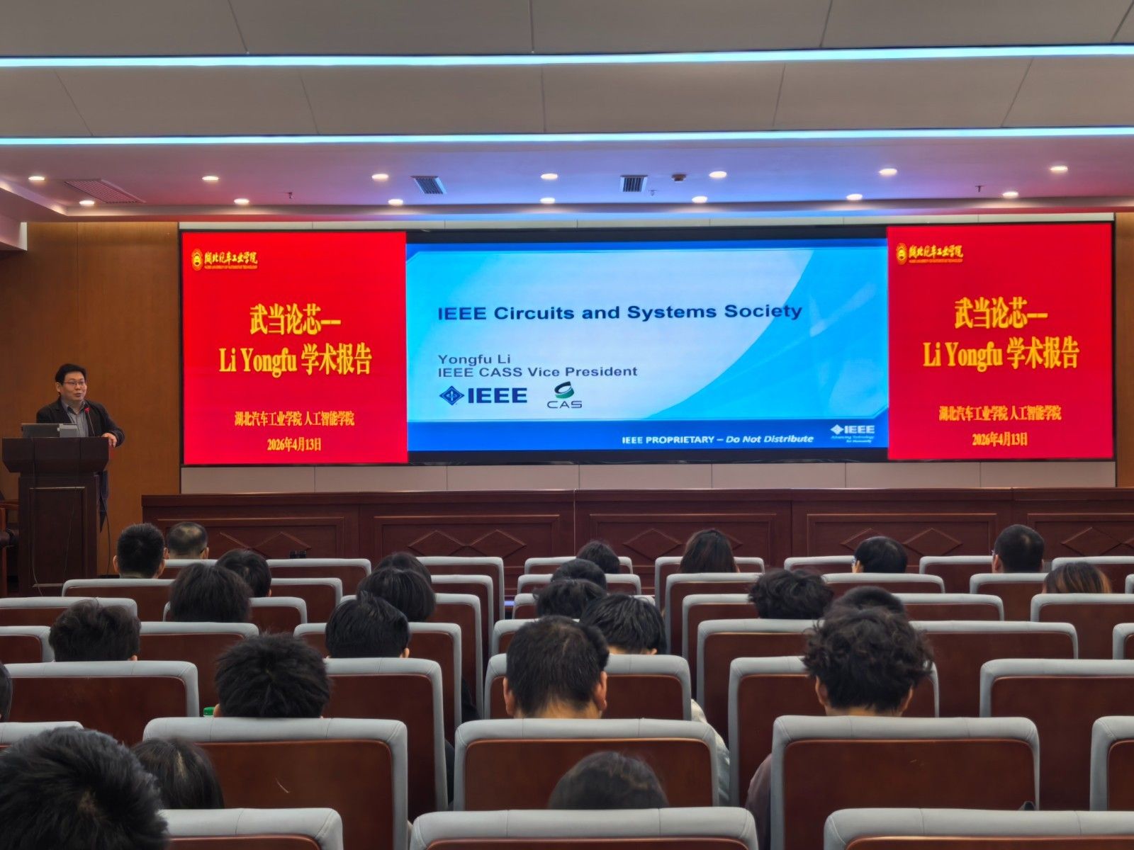 本网讯(文/图 曾明玉、郭琳)4月13日上午,IEEE Circuits and Systems Society(CASS)副主席、国家海外高层次人才计划入选者、IEEE Data Description创刊副主编、上海交通大学集成电路学院长聘副教授Li Yongfu应邀来校开展学术交流,并为我校师生作了题为Introduction to IEEE and IEEE CASS及Digital Auscultation for Cardiac and Respiratory Systems的两场学术报告,华中科技大学光学与电子信息学院王超教授一同参加此次交流。报告会由人工智能学院副院长周原主持,学院青年博士、副高及以上教师,全体2024级、2025级研究生及本科生代表参会。
