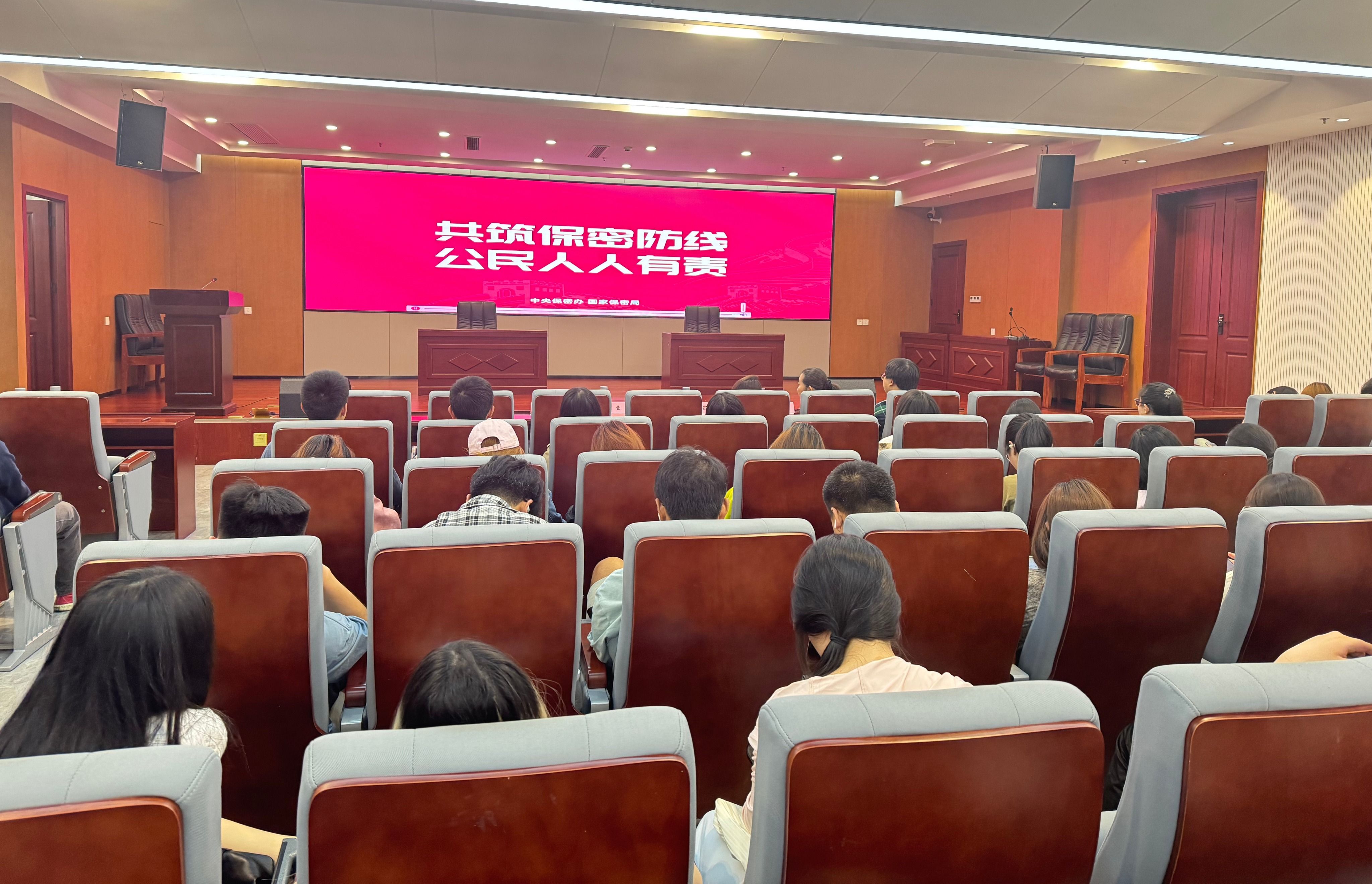 本网讯(文 方从婷、邵帅、高歌、吕鑫彬/图 龙胜锋)为深入贯彻落实总体国家安全观,筑牢保密安全观,强化团员青年的责任意识与纪律观念,夯实团组织思想建设,4月17日,设计学院在产教三楼报告厅开展“国安筑防线,青春守家园”示范性主题团日活动,张湾区政法委董超、校团委副书记胡霄寒、挂职副书记杜辰楠、设计学院党委副书记王新、保卫处邵帅、二级学院团委书记以及160余名团员出席活动。
