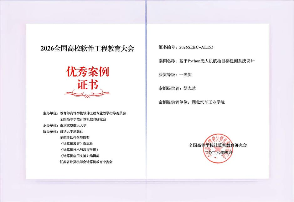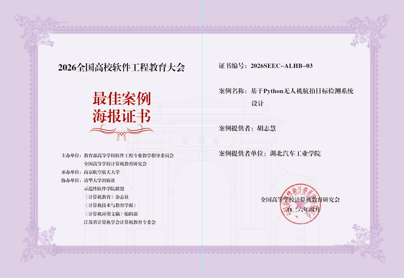 本网讯(文/胡志慧)近日,2026年全国高校软件工程教育大会在南京举行。大会以“智赋软工,育见新程”为主题,聚焦新时代软件工程教育改革与创新,重点围绕课程体系优化、工程实践能力培养、AI赋能教学、产教协同育人以及国产化软件生态融入等核心议题进行分享与交流。在大会备受关注的教学案例评选中,我校智能网联汽车学院教师胡志慧设计的教学案例从众多参赛作品中脱颖而出,荣获教学案例一等奖,并被评为最佳案例海报。