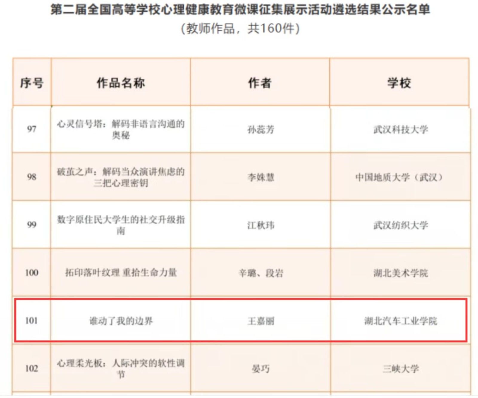 本网讯(文/刘俊)近日,第二届全国高等学校心理健康教育微课征集展示活动遴选结果公示。我校大学生心理健康教育中心专职教师王嘉丽的作品《谁动了我的边界》成功入选。据悉,湖北省高校共有16项教师作品入围,我校位列其中。