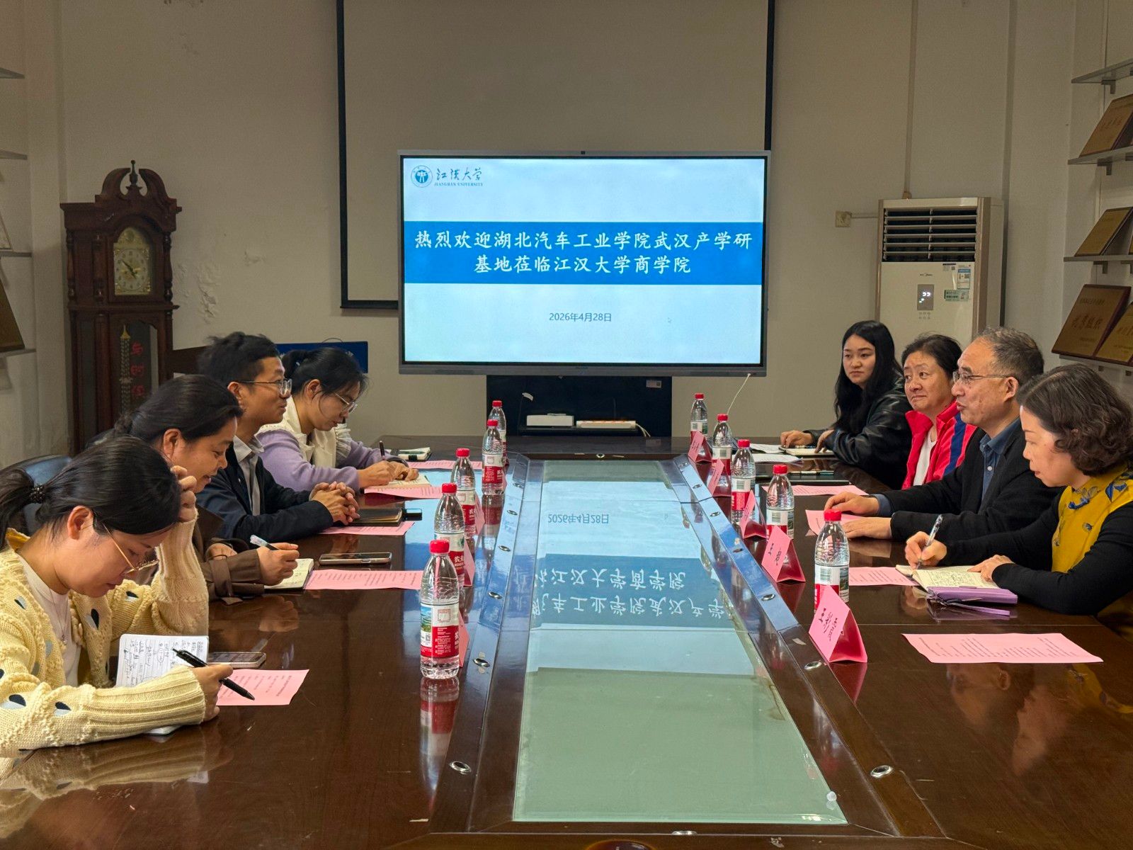 调研期间,黄其新对武汉产学研基地一行表示诚挚欢迎,系统介绍了学院学科专业、师资团队、学生发展等整体情况。商学院“商涯”辅导员工作室负责人、商学院党委副书记王超详细介绍了工作室在聚焦学生生涯发展、校企协同育人、特色活动开展等方面的典型做法与成效,其中“商涯工作室”精准化、前置化的就业服务模式成为讨论焦点。双方围绕引导学生将职业愿景转化为具体行动、就业技能的系统性培养以及辅导员工作室的长效运行机制等问题展开深入探讨。