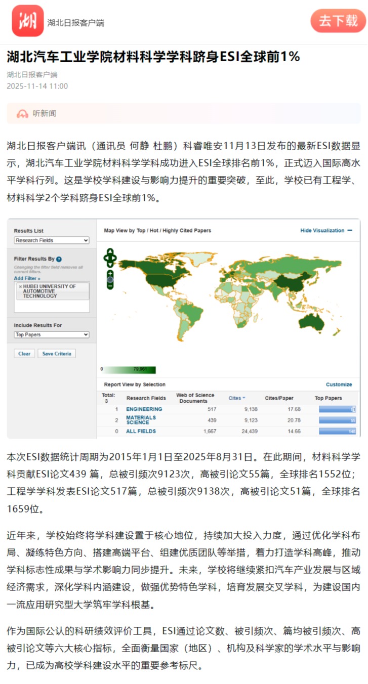 【湖北日报】湖北汽车工业学院材料科学学科跻身ESI全球前1%