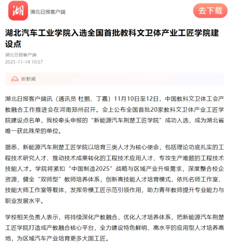 【湖北日报】湖北汽车工业学院入选全国首批教科文卫体产业工匠学院建设点