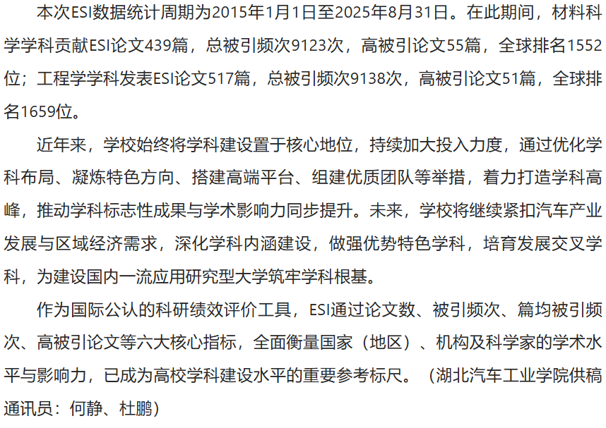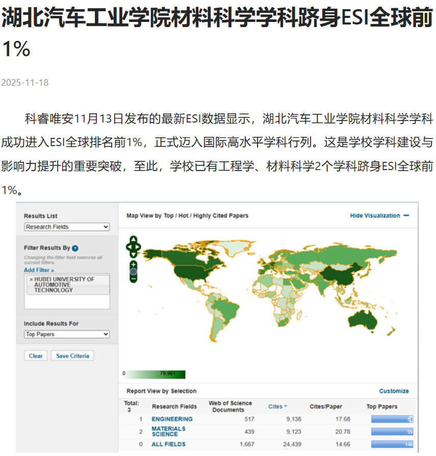 【人民数字联播网】湖北汽车工业学院材料科学学科跻身ESI全球前1%