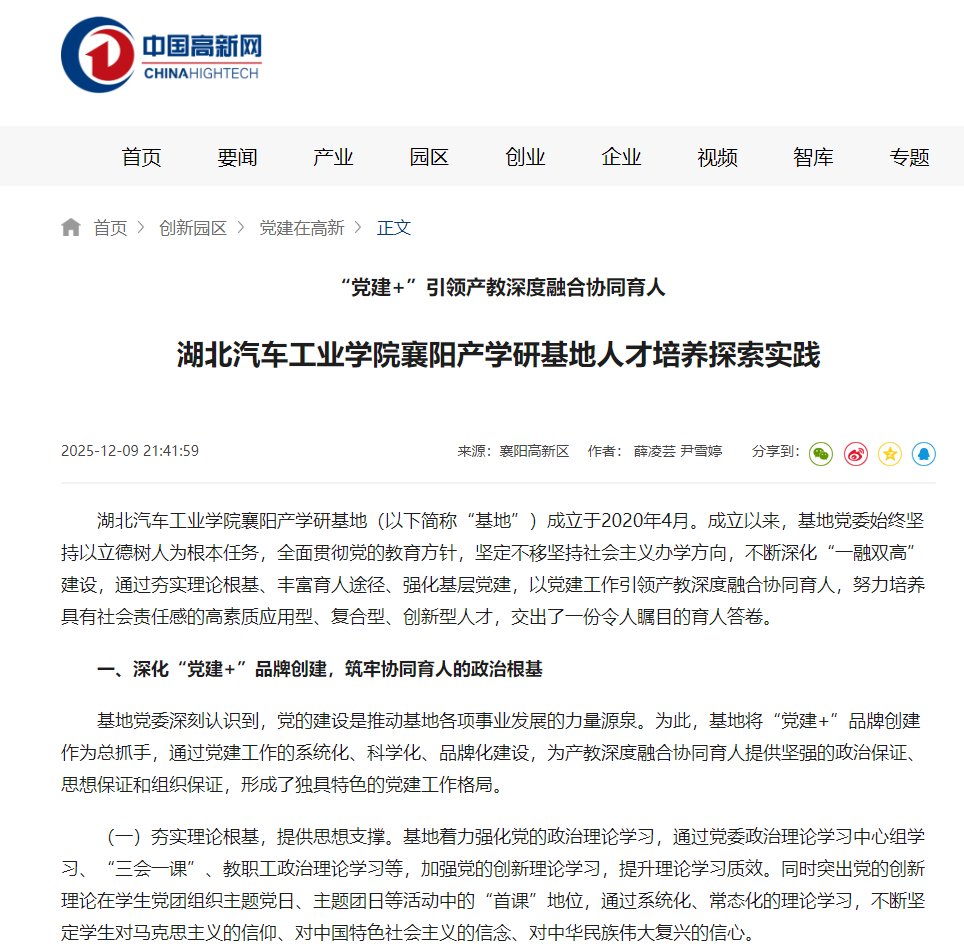 【中国高新网】“党建+”引领产教深度融合协同育人 湖北汽车工业学院襄阳产学研基地人才培养探索实践