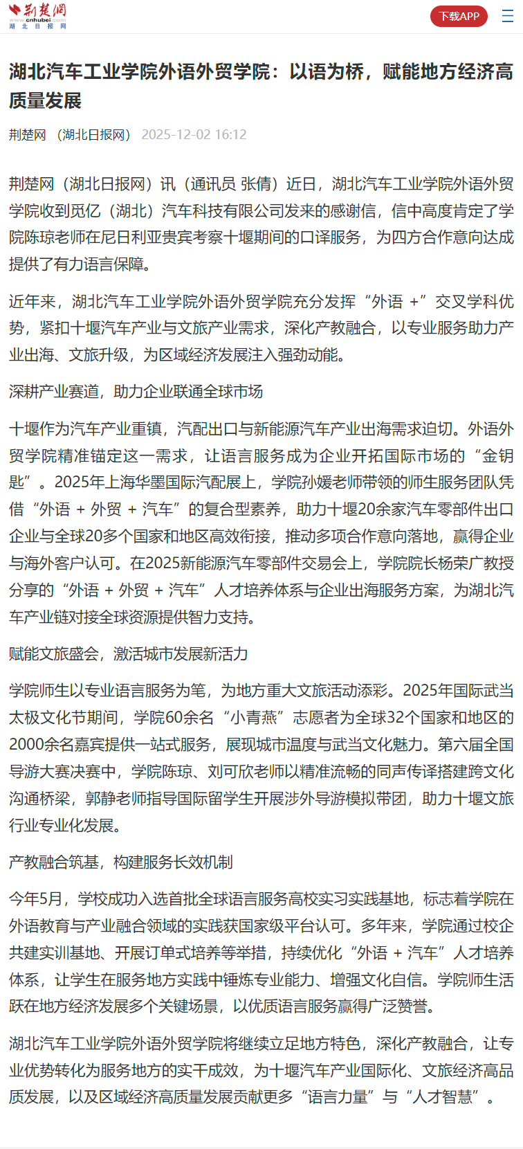 【荆楚网】湖北汽车工业学院外语外贸学院:以语为桥,赋能地方经济高质量发展