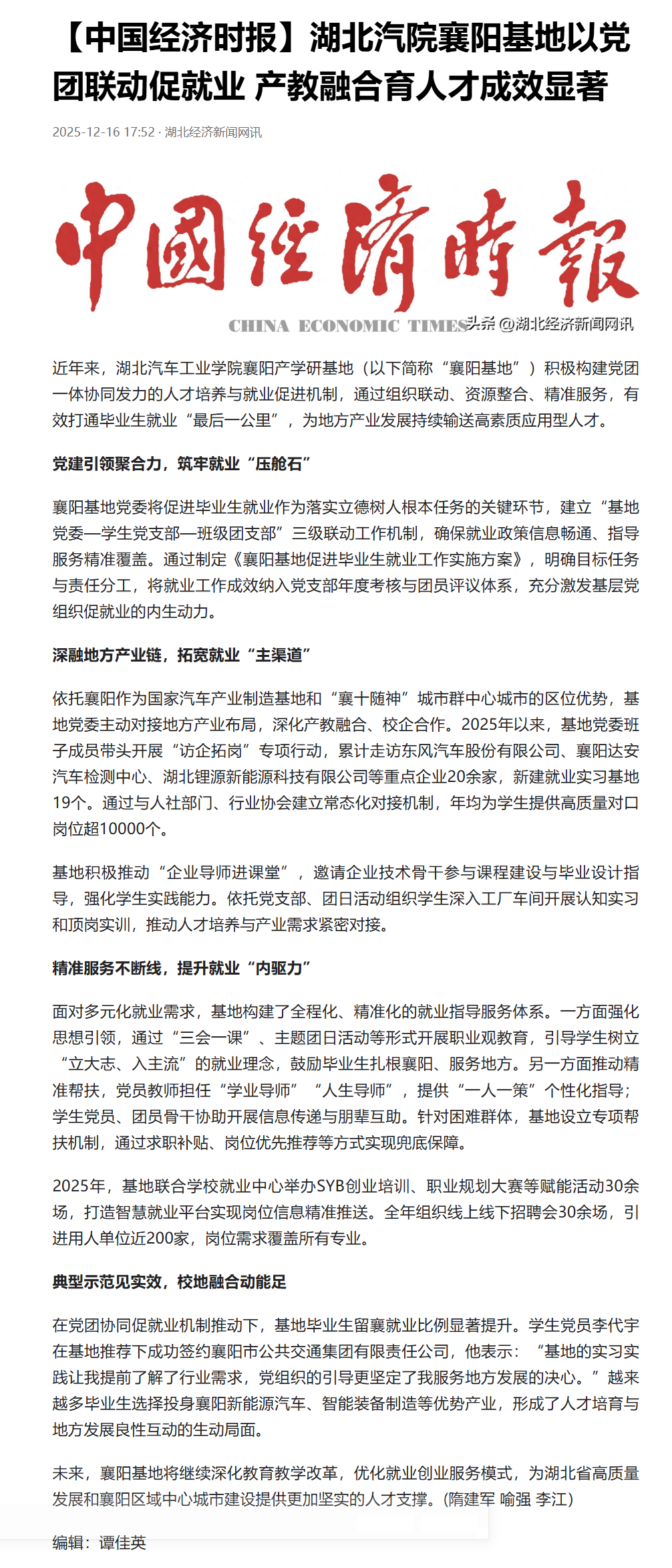 【中国经济时报】湖北汽院襄阳基地以党团联动促就业 产教融合育人才成效显著