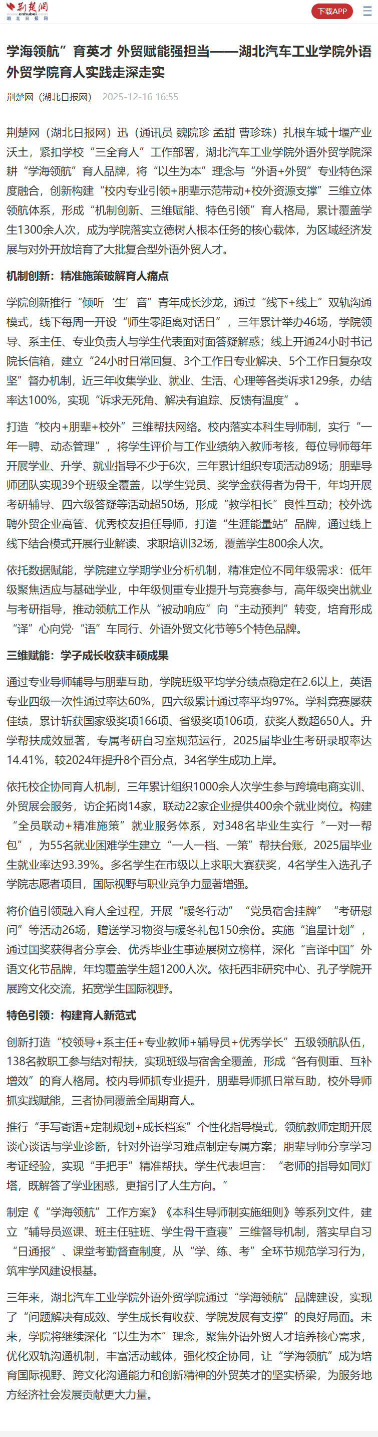 【荆楚网】学海领航”育英才 外贸赋能强担当——湖北汽车工业学院外语外贸学院育人实践走深走实