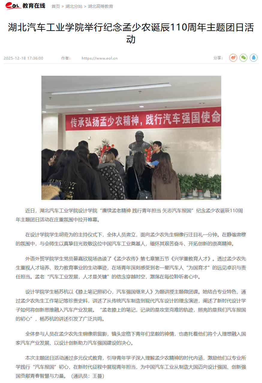 【中国教育在线】湖北汽车工业学院举行纪念孟少农诞辰110周年主题团日活动