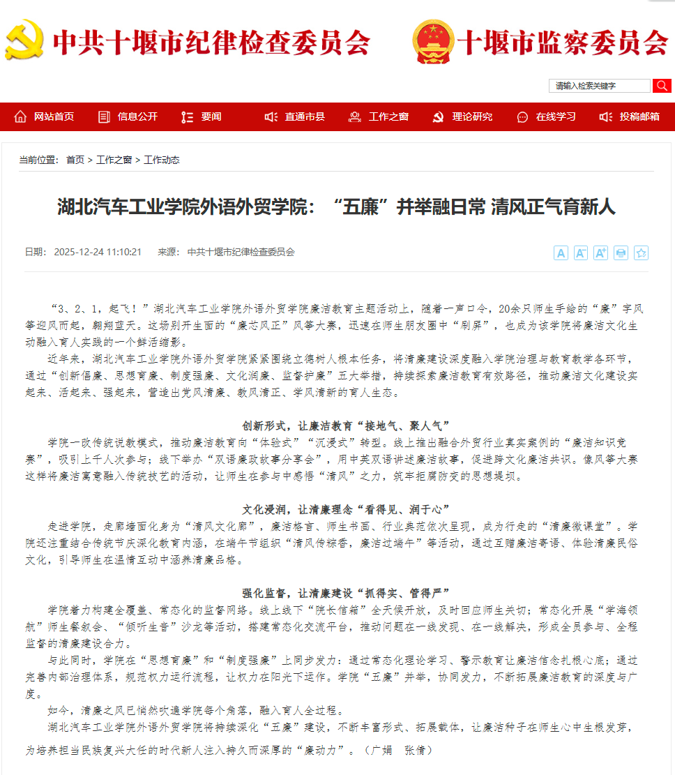【十堰市纪委网站】湖北汽车工业学院外语外贸学院:“五廉”并举融日常 清风正气育新人