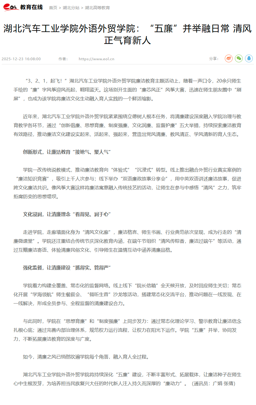 【中国教育在线】湖北汽车工业学院外语外贸学院:“五廉”并举融日常 清风正气育新人