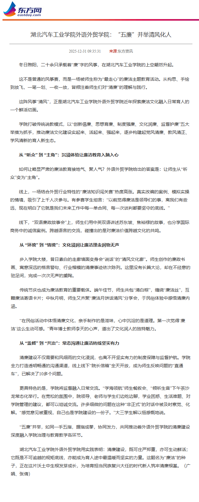 【东方网】湖北汽车工业学院外语外贸学院:“五廉”并举清风化人