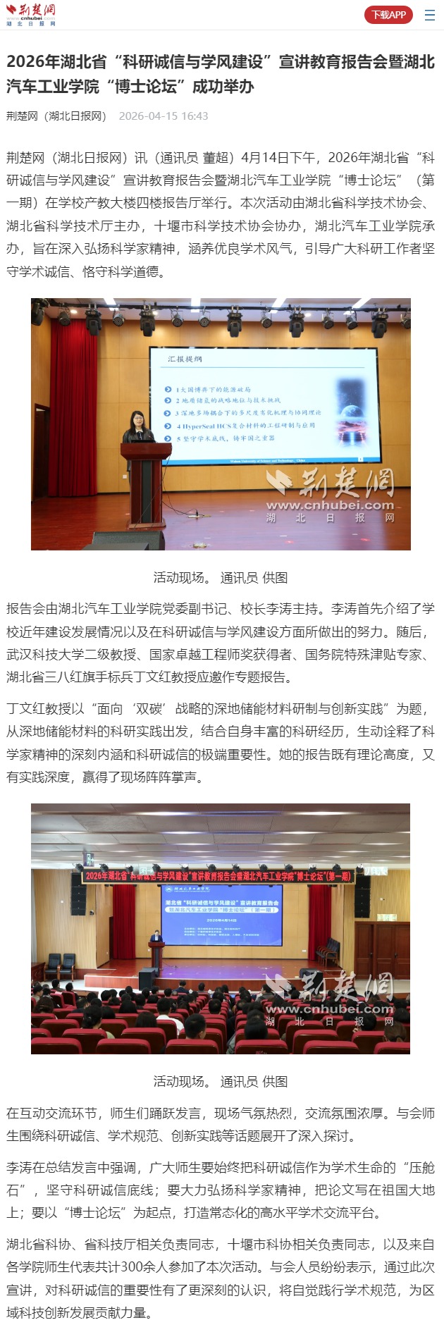 【荆楚网】2026年湖北省“科研诚信与学风建设”宣讲教育报告会暨湖北汽车工业学院“博士论坛”成功举办
